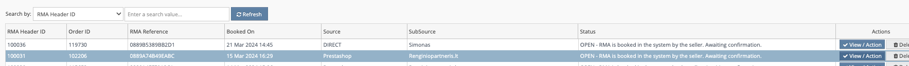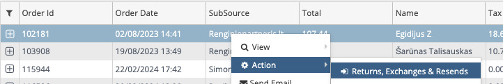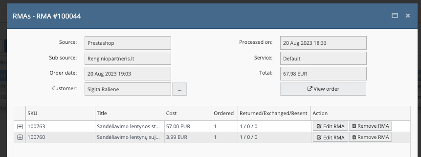 RMA supildžius visas grįžusias užsakymo prekes, spaudžiame “Action”