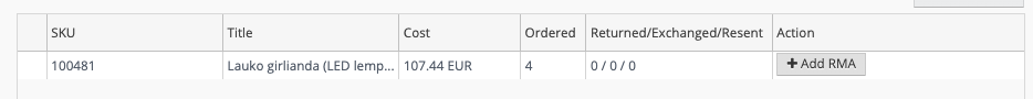 - Pasirienkam prekę, kuri grįžo (kurią registruojame) ir spaudžiame “Add RMA”