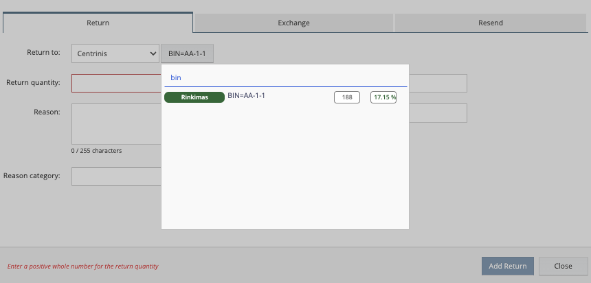 Po “Action” mygtuko paspaudimo likutis bus grąžintas į pardavimą, į nurodytą sandėliavimo vietą (Binrack’ą)